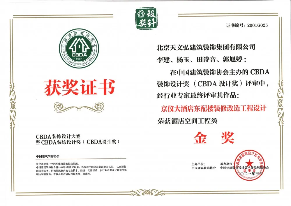 恭喜我司設計團隊在中國建筑裝飾協會主辦的 CBDA裝飾設計獎評審中,經行業專家最終評審其作品“京儀大酒店東配樓裝修改造工程設計”榮獲酒店空間工程類金獎。