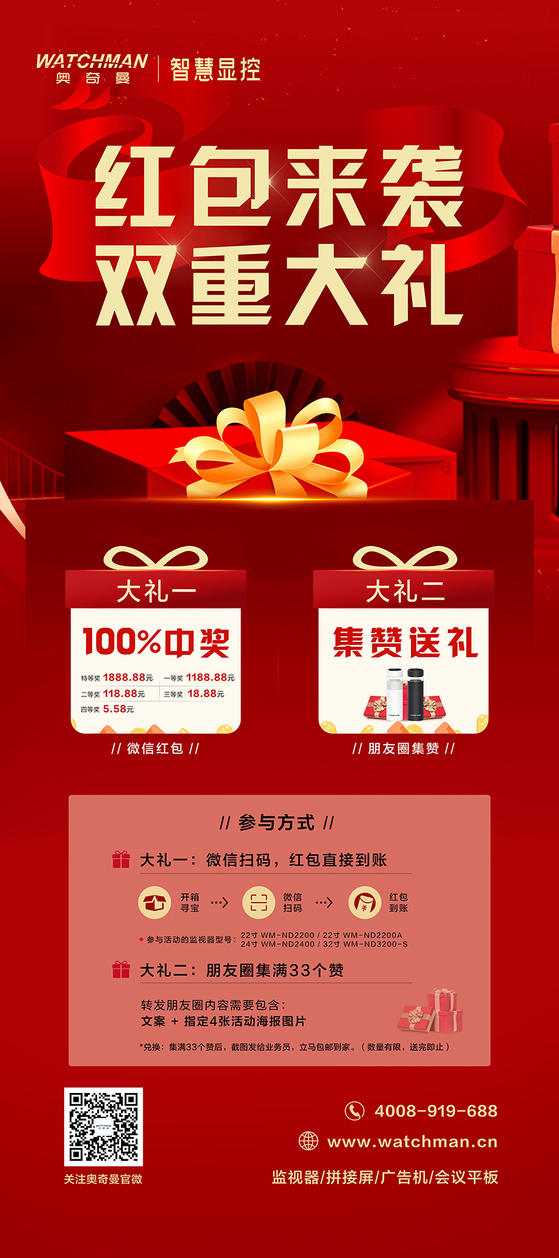 #奧奇曼 智慧顯控雙重大禮來襲~ 1.微信掃碼開箱特等獎1888.88元 2.朋友圈集滿33個贊送精美禮品一份 專業品質,眼見為實! 陪您看精彩視界