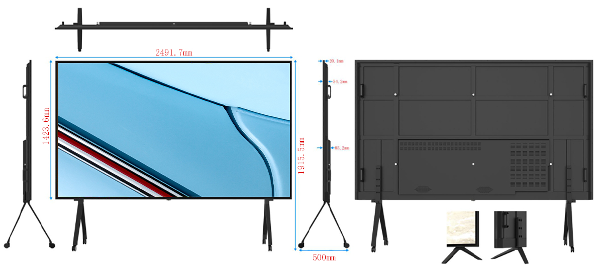凈重 110kg 毛重 142kg 裸機外形尺寸 (W*D*H)不含底座 2491.7mm*92.7mm*1423.6mm (主體厚度:55mm) 詳見產品六視圖 裸機外形尺寸 (W*D*H)含底座 2491.7mm*500mm*1915.5mm (底座見效果圖) 包裝尺寸(W x D x H) 2685×285×1710mm(長*寬*高) 蜂窩紙箱+珍珠棉 外殼材料 模具沖壓背板+五金后蓋+鋁合金拉絲前框 外殼顏色 全黑色 VESA孔位 1600mm*700mm |